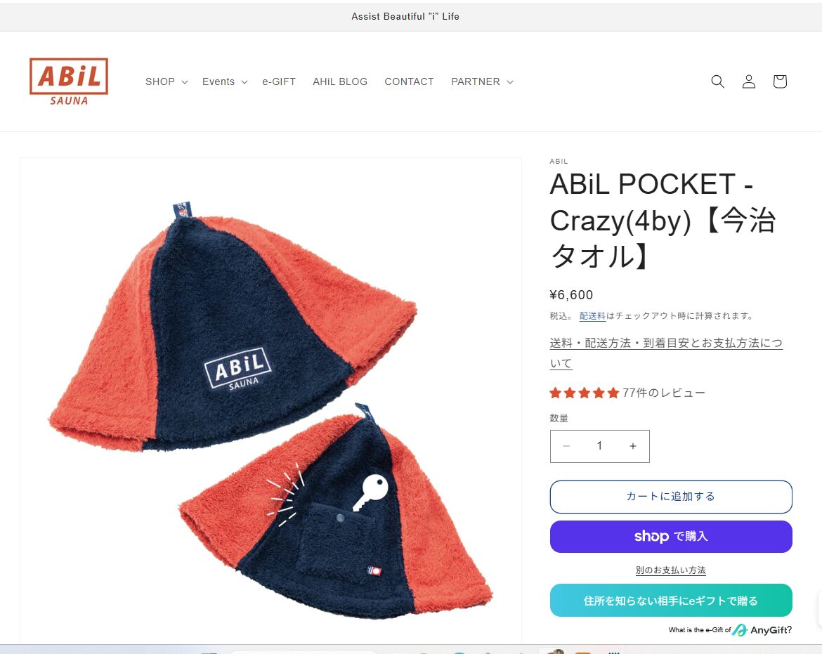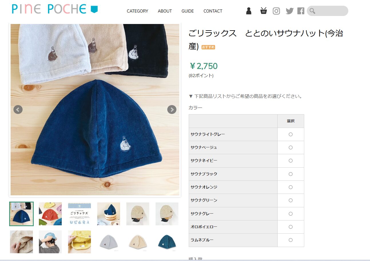 細かなパイル生地で肌触りがよく、ネイビー・ブラック・グレー・ベージュの4色展開。価格も約3,000円と手頃で、初めてのサウナハットとしても選びやすい一枚です。